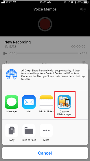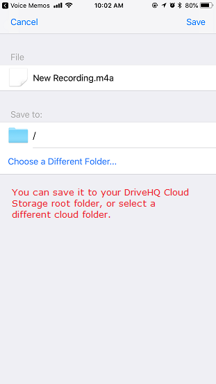Save Files from Voice Memo to DriveHQ Cloud Storage using FileManager App