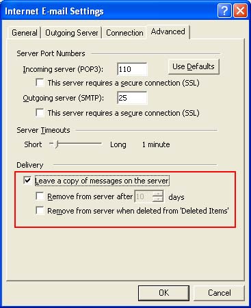 In Outlook, please make sure you have checked “Leave a copy of messages on the server ” in