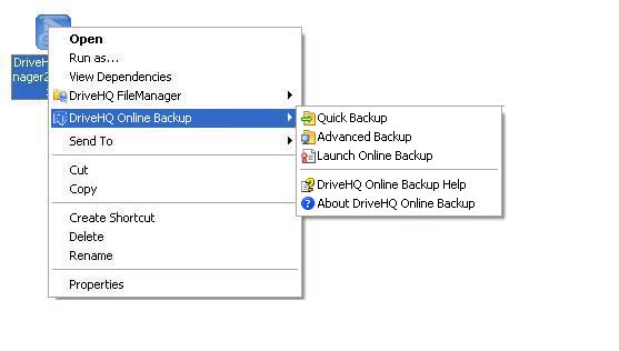 popup "DriveHQ Online Backup" menu that includes Quick Backup, Advanced Backup and Launch Online Backup, shown as below: