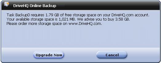 NOTE: DriveHQ offers 1GB storage space and up to 406MB download bytes as soon as you sign up a DriveHQ account. The application will scan the size of backup data automatically. If the backup data exceeds your storage space, it will pop up a message box to prompt you to order more space, shown as below: