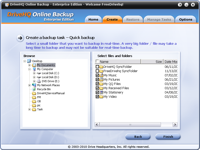 From the "Create a backup task" screen, click on Quick Backup button to create a simple Real-time backup task. You just need to select a backup source folder. Navigate the Windows Folder tree as shown below: