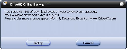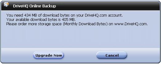 NOTE: DriveHQ provides 1GB storage space and 406MB download bytes as soon as you sign up as a DriveHQ member. The application will scan the size of backup data automatically. If the restore data exceeds your download bytes, it will pop up a message box to prompt you to order more space, shown as bellow: