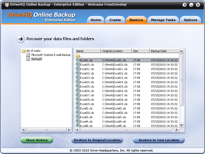 You can use DriveHQ Online Backup to restore old version files. To do so, from the Restore tab, click on the task name, then navigate the folders and locate the file that you want to restore. Click on the filename to select the file. Note if you want to restore an older version, then you can only select one file. After you select one file, the "Show History" button at the bottom left corner will become enabled as shown below.