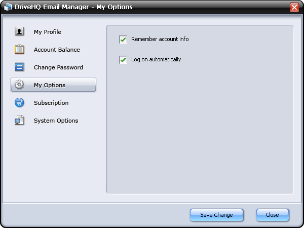 From DriveHQ Email Manager main screen, click on the Options button in the toolbar, and the screen "DriveHQ Email Manager - My Options" will pop up: