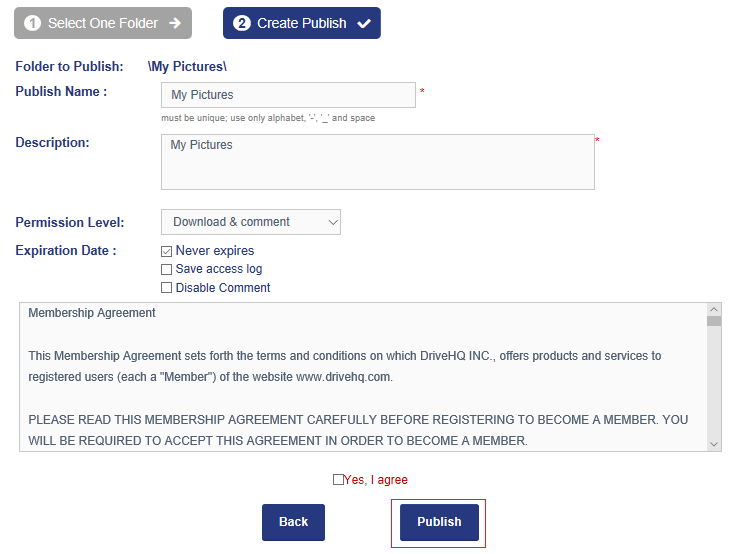 Check the checkbox to agree to the terms, then click Publish. The folder will be published.