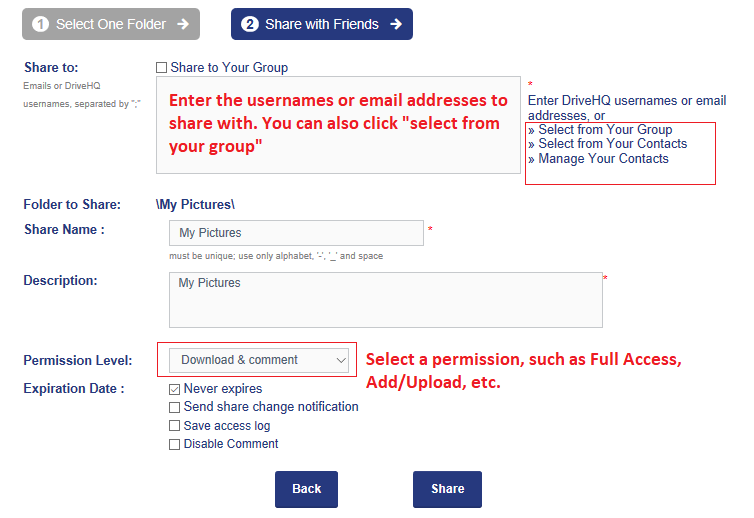 You can share folders to different users with various permissions. In the above screenshot, you can enter the usernames or email addresses