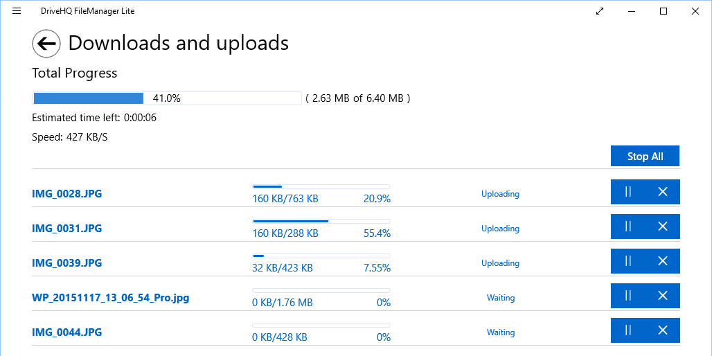 which displays a list of files being uploaded/downloaded. You can pause or remove a file from the transfer list.