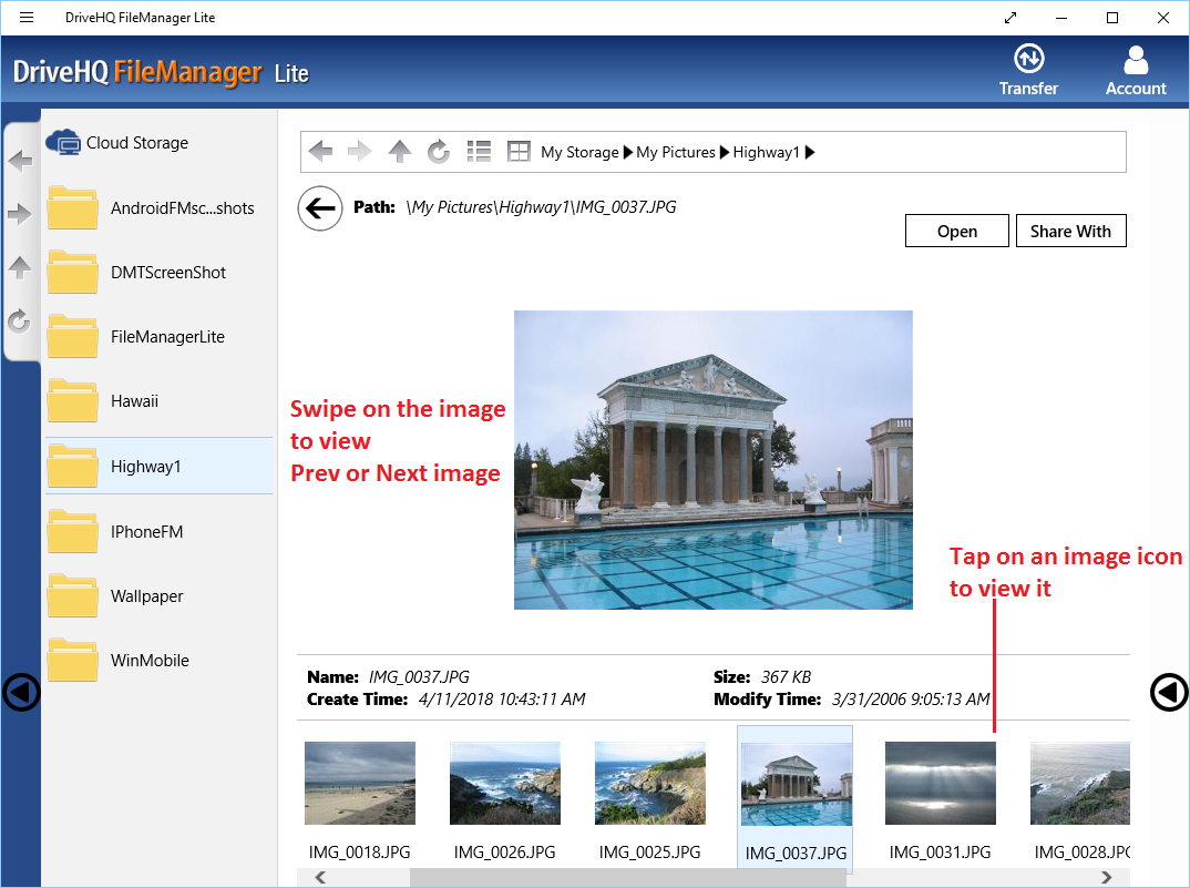 FileManager Lite can view cloud and local images very efficiently. In the main window, double tap on an image thumbnail,