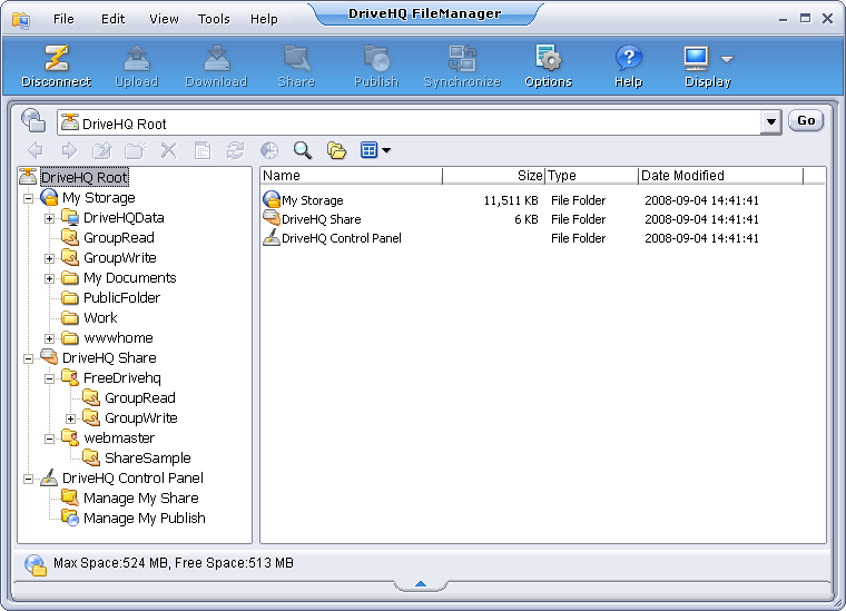 - DriveHQ Control Panel folder: It is a virtual folder linking to all tools for setting up your account options and managing the share and