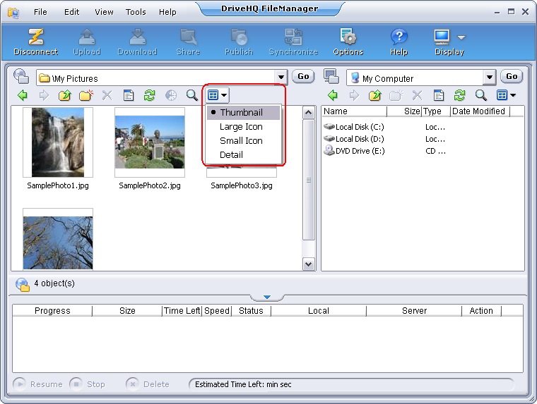 DriveHQ FileManager can display folders using Thumbnail / Icon / Detail Views. By default, it displays folders in detail view. You can change it to other view by clicking in the toolbar, as shown below: