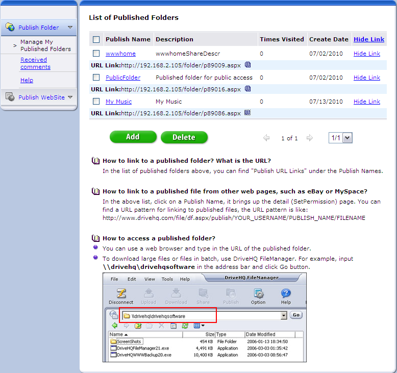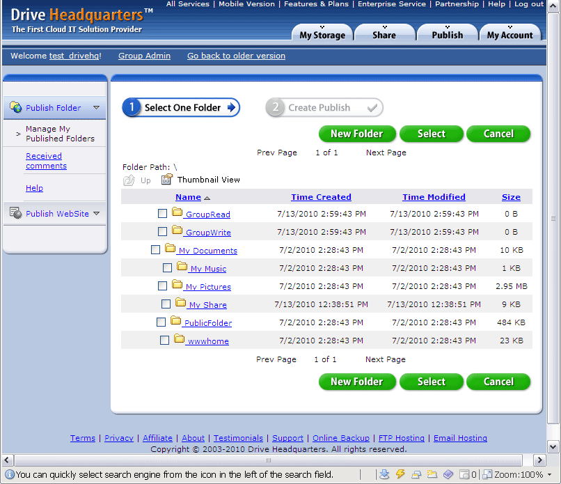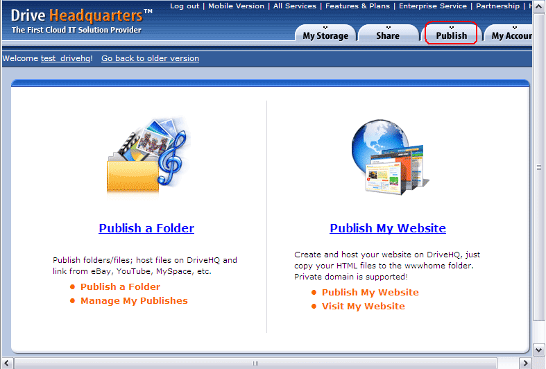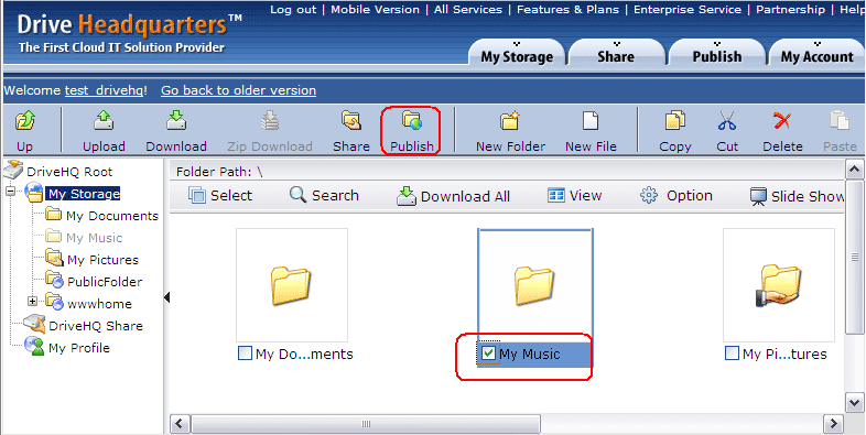 The system automatically creates "PublicFolder" for Paid members and True members. There are two ways of publishing a folder on DriveHQ.