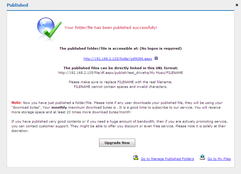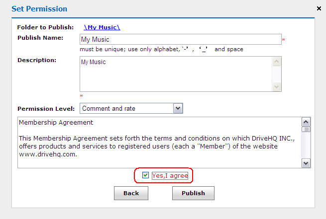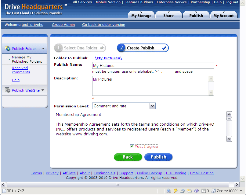 To publish a folder on DriveHQ, you must be a Paid Member or True member.