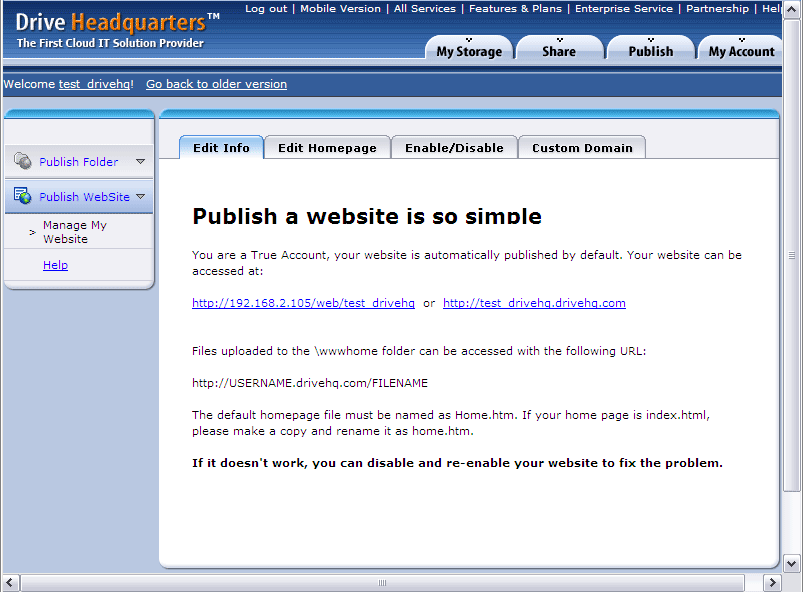 If you have a paid account, your website is automatically published. You can access your website on DriveHQ at: http://USERNAME.firstcloudit.com