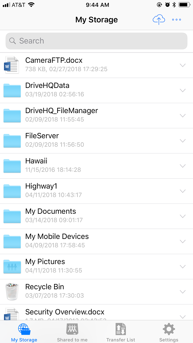 DriveHQ FileManager for iPhone Main screen (showing cloud files):