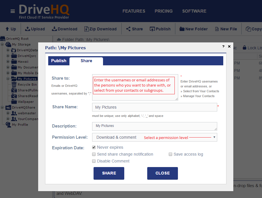 DriveHQ's Cloud File Sharing & Collaboration feature is not only easy but also powerful. You just need to right click on a folder and