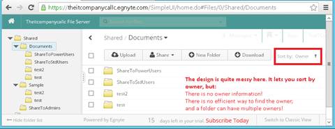 It is very difficult to find the folder owners with Egnyte's web interface (See the screenshot below). The folder list does not display the folder owner even though it supports sorting by owner and a folder may have multiple owners.