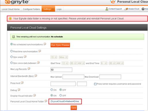 As you can see from the screenshot below, when you install Egnyte Local Cloud, if you select a network folder, it will report an error message: "Your Egnyte data folder is missing or not specified. Please uninstall and reinstall Personal Local Cloud."