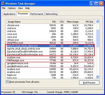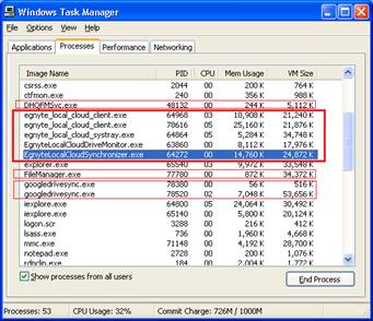 Egnyte installs a local web server (likely to be some open source web server) to interface with the web browser and the cloud. Therefore it is at least 50% less efficient in terms of memory usage, CPU and communication overhead than DriveHQ FileManager. The screenshots below show the memory usage when Egnyte Desktop Sync is idle and when it is synchronizing.