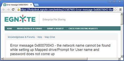 https://helpdesk.egnyte.com/entries/21587905-Error-message-0x80070043-the-network-name-cannot-be-found-while-setting-up-Mapped-drive-Prompt-for-U ((Error message 0x80070043 - the network name cannot be found while setting up Mapped drive/Prompt for User name and password does not come up)