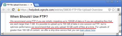 Also, Egnyte recommends using FTP to upload large amount of data or files larger than 1GB: