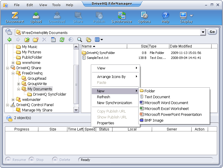 In the above screen, since the folder My Documents was shared with full-access right, he can right click on a blank area to create files / folders in it. He can also drag and drop files / folders into this shared folder. If the folder is shared with read-only access, then the menu item "New" will be disabled and you cannot upload files into the shared folder.