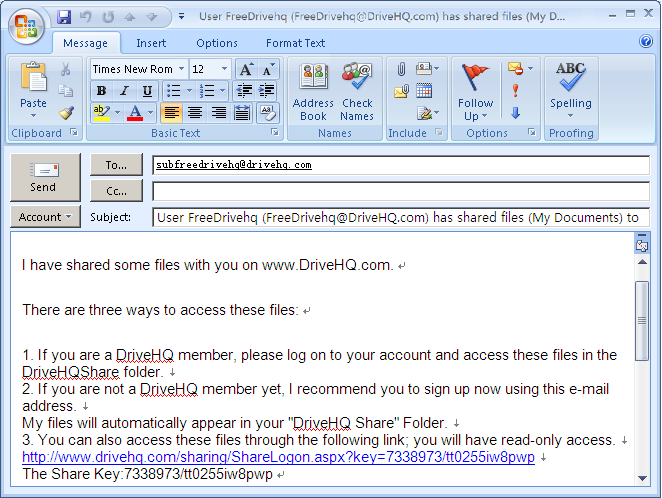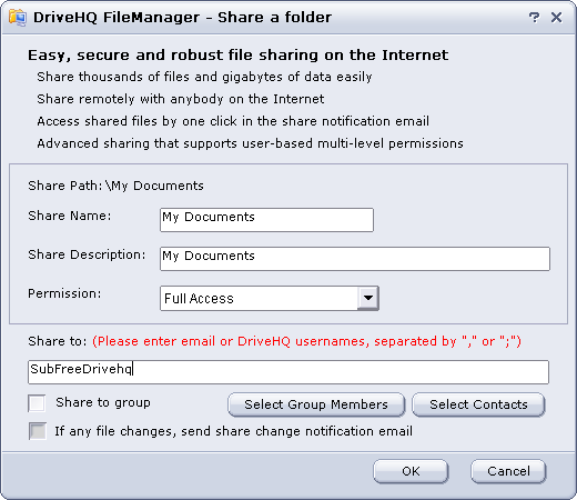 • The remote folder "\My Documents" has been shared to the user: SubFreeDrivehq. If all Share-to users are DriveHQ members, then it is not necessary to send the share notification email. The "share-to" users can logon www.drivehq.com or DriveHQ FileManager, go to the virtual folder: \DriveHQ Share\YOUR_USERNAME\SHARE_NAME
