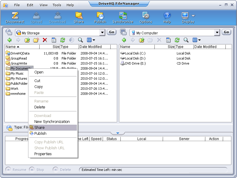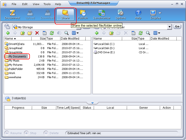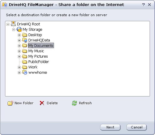 • Basically, you need to upload the files to DriveHQ storage first. Then it will share the uploaded folder online. This sharing method is far better than other local-network based folder sharing methods:
