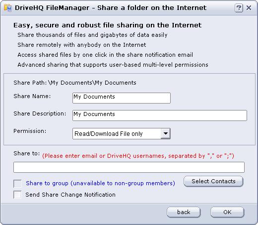 In the Share-to field, please enter the email addresses or DriveHQ username of the persons who you want to share the folder to. If the person does not have a DriveHQ account, or if you don't know the person's DriveHQ username, you can just use the person's email address. You can enter multiple usernames / email addresses separated by "," or ";".