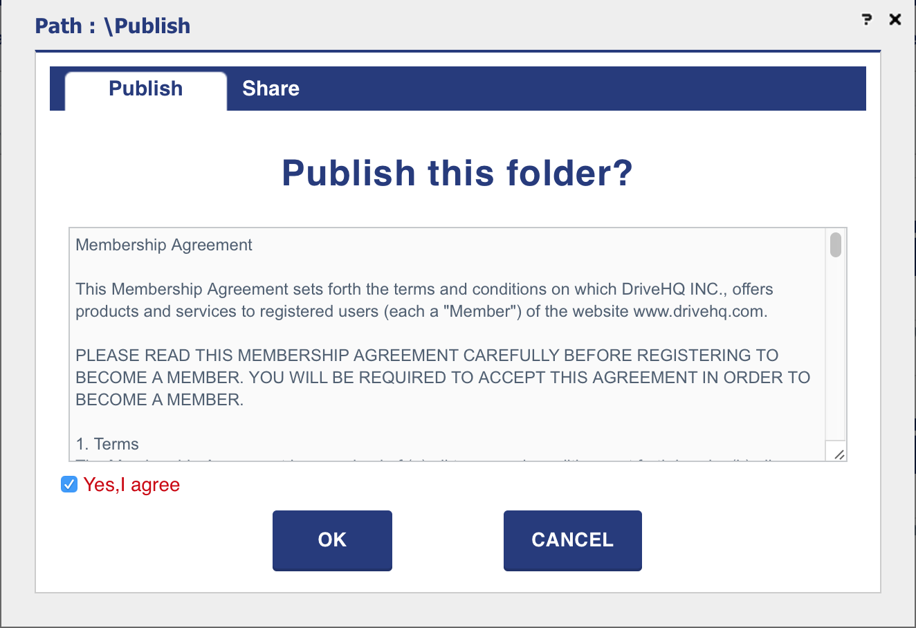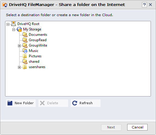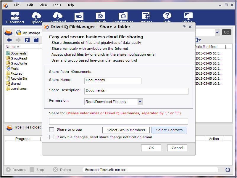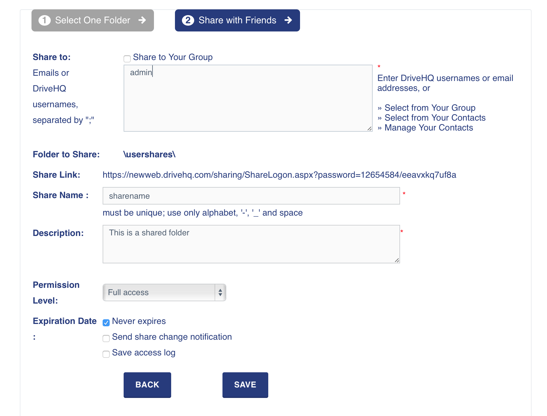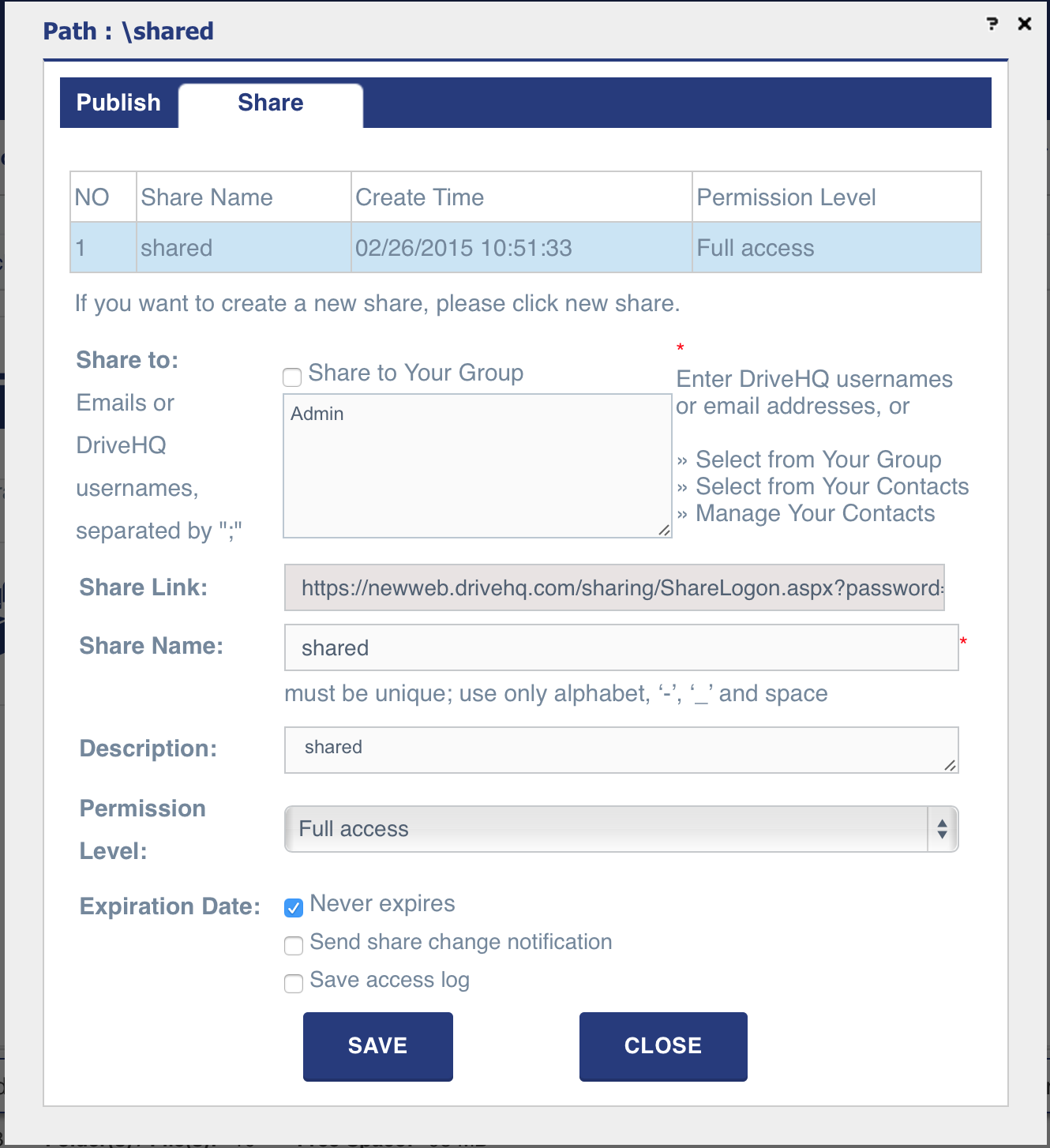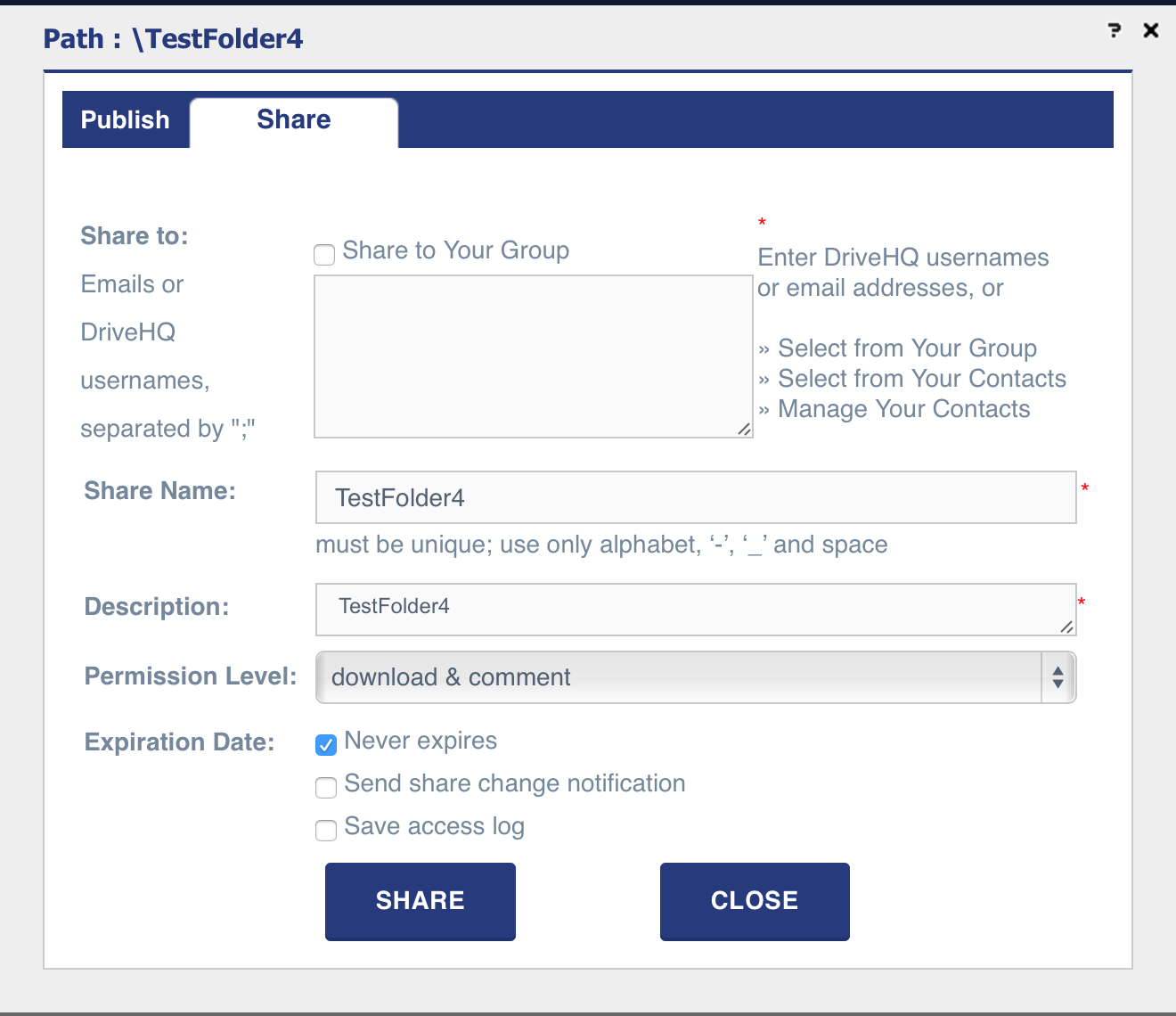 o Share a folder / file to other users using email addresses or DriveHQ usernames and set an access level.