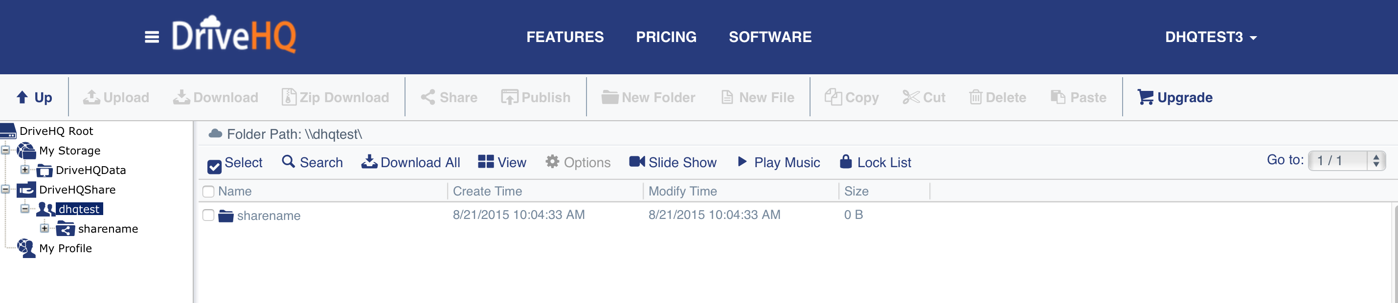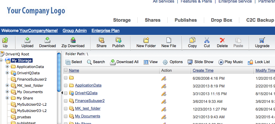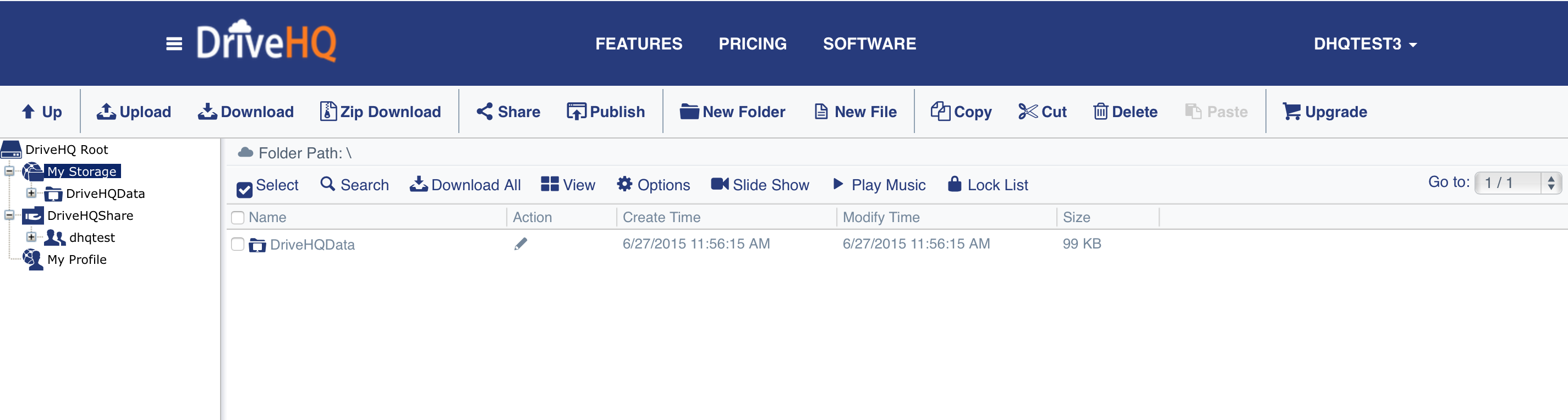 Once you have a DriveHQ account, you can logon using your username or email and password. By default, it will go to the “My Storage” page, as shown below: