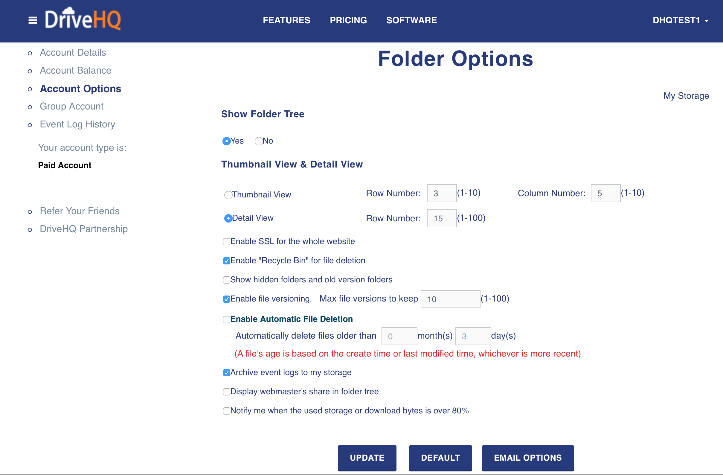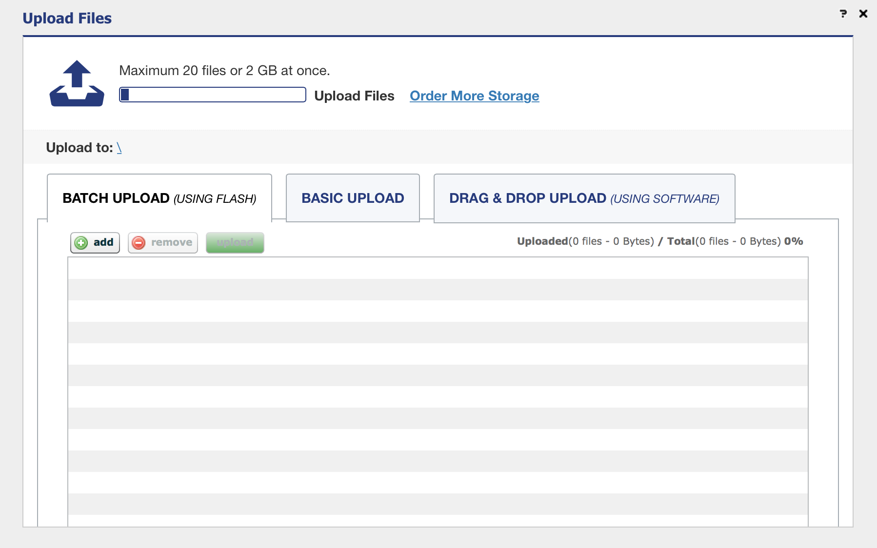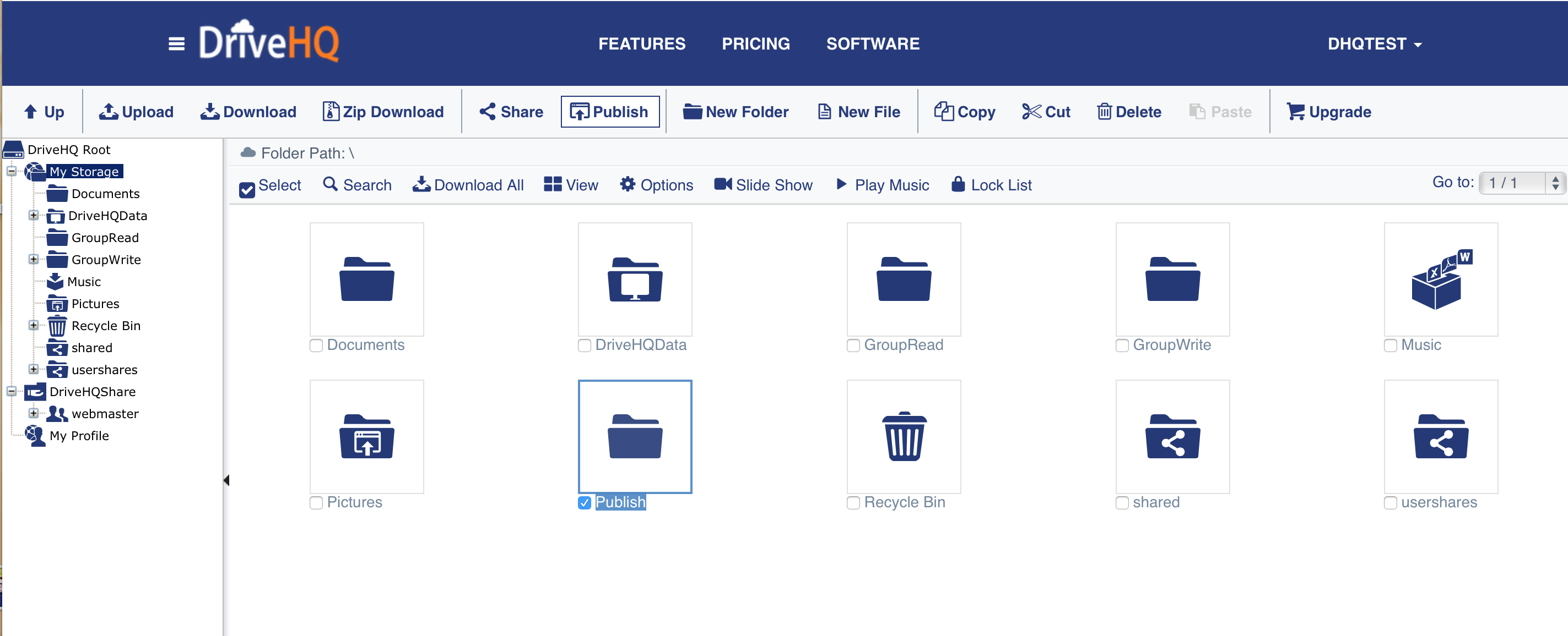 Once you have a DriveHQ account, you can logon using your username or email and password. By default, it will go to the “My Storage” page, as shown below: